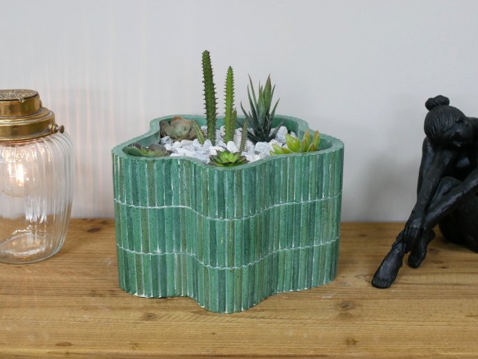Made from resin. Price is for planter only, plants and stones not included.