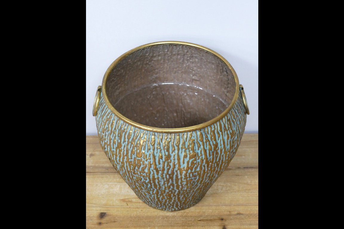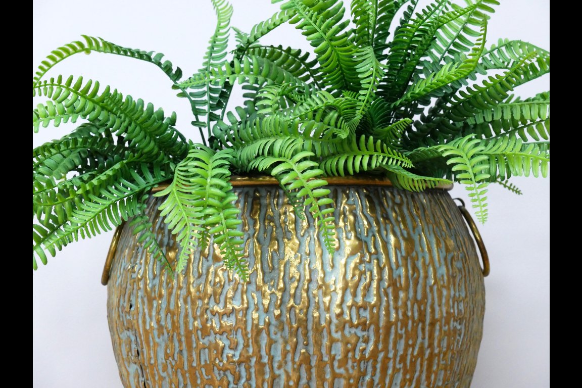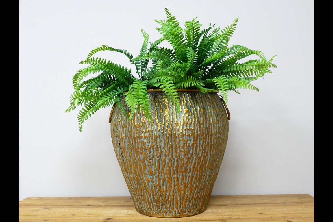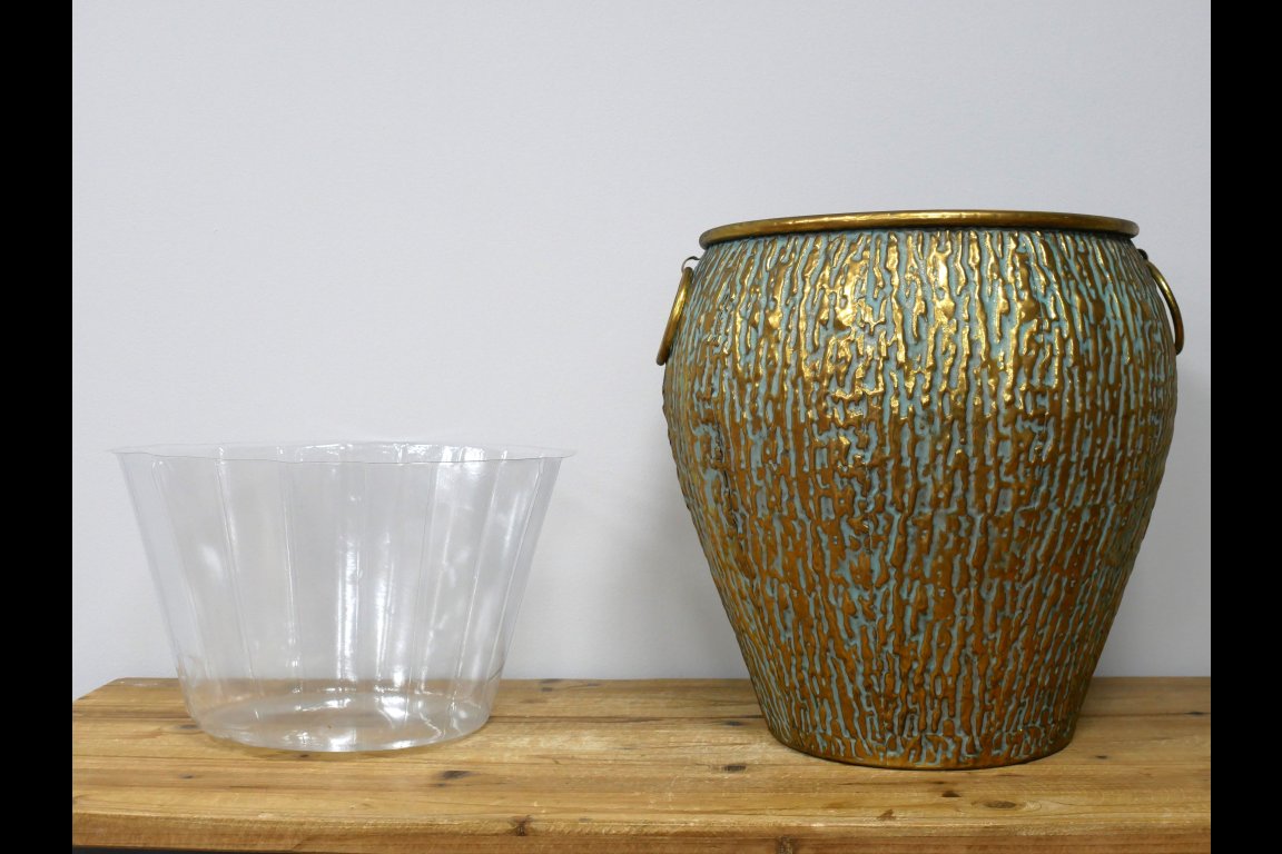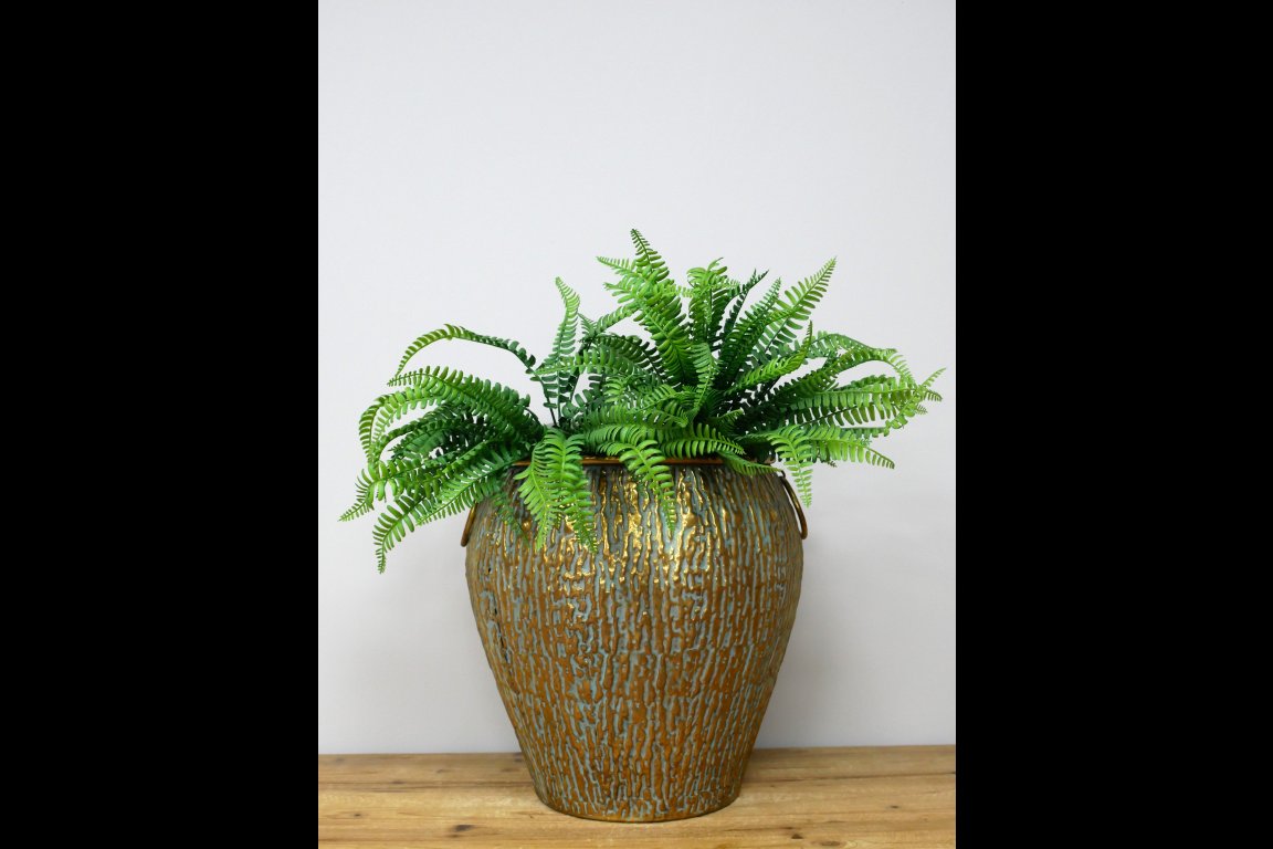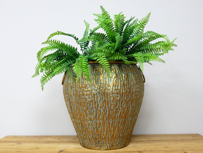 Made from metal. Item comes with a plastic liner, best suited for artificial plants.