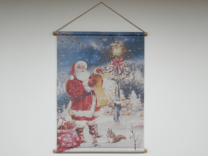 Printed picture on canvas with wooden poles top and bottom and a hanging rope. The size stated is the picture.